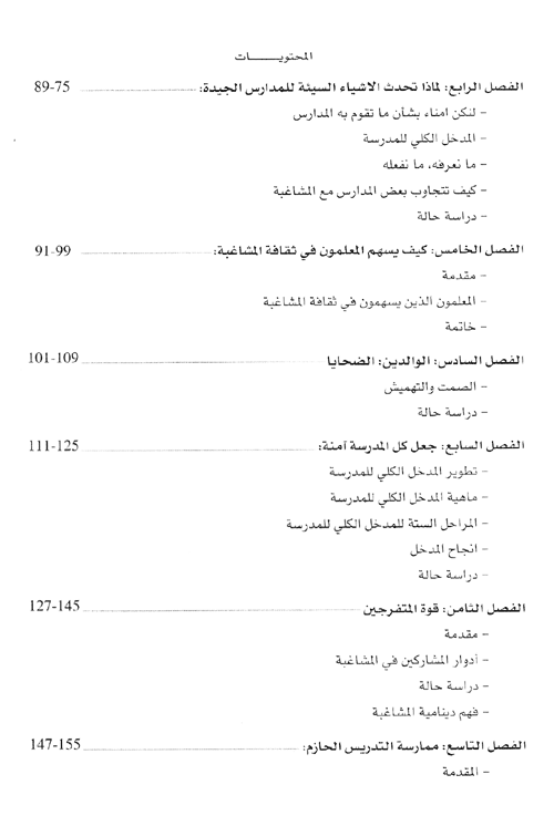 والفصل الرابع يلقي نظرة ثاقبة عما يحدث في المدارس الآمنة وما هو المدخل الكلى للمدرسة اللازمة إتباعه، أما الفصل الخامس والسادس فيتصدى لظاهرة خطيرة جداً وهو كيف أن المعلمين يمكن أن يسهموا بشكل غير مباشرة في نشر ثقافة المشاغبة وكيف أن الآباء هم ضحايا ثانويين لها ويتناول الفصل السابع مفهوم المدخل الكلى للمدرسة الآمنة.