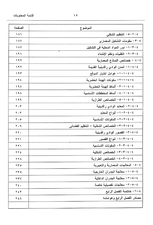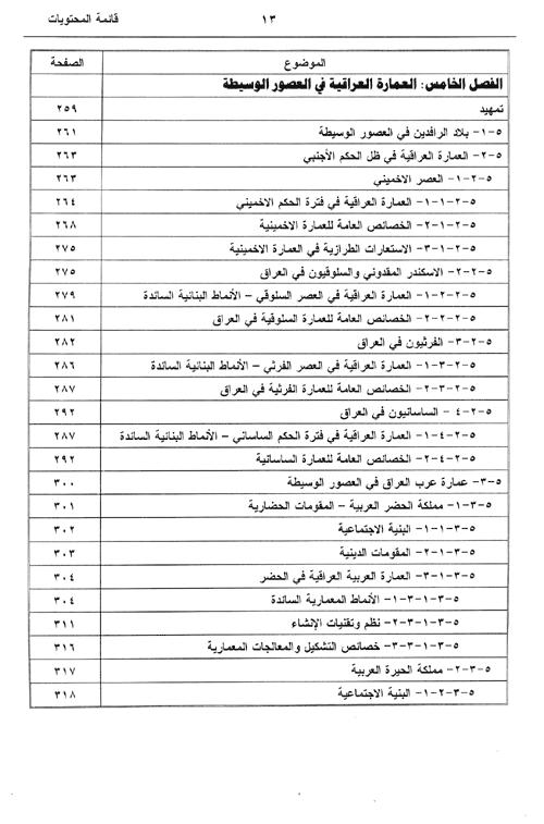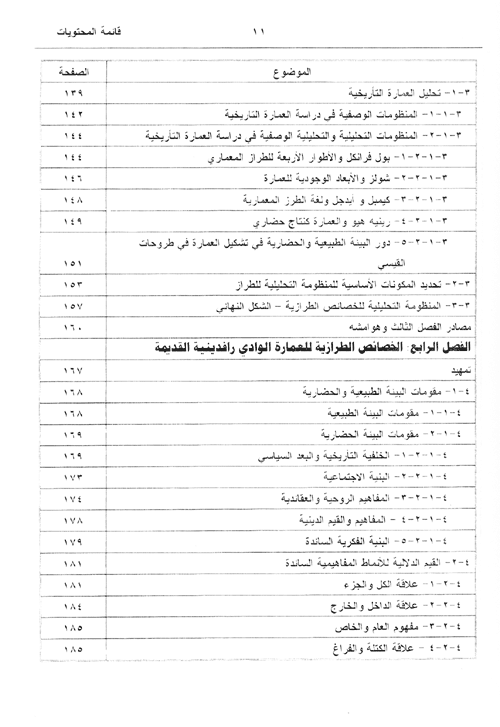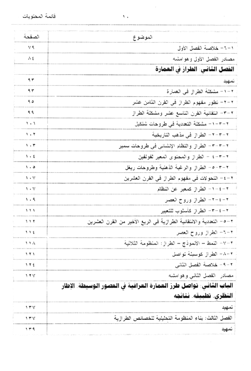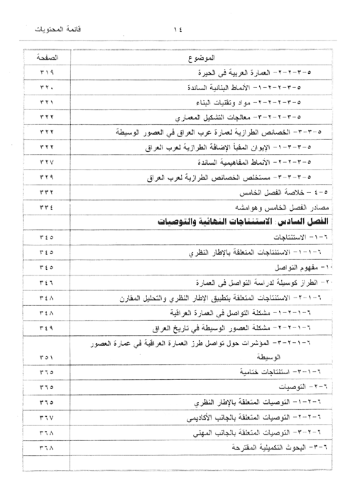 وبشكل عام تألف هذا البحث من بابين رئيسين يشتملان على مقدمة وستة فصول. الباب الأول يركز على بناء القاعدة المعلوماتية والمعرفية الأساسية فيما يتعلق بالبعد المفاهيمي لمصطلح التواصل ووسائل دراسته وتشخيصه في تاريخ العمارة وإمكانية اعتماد دراسة الطرز المعمارية كوسيلة لهذا الغرض.