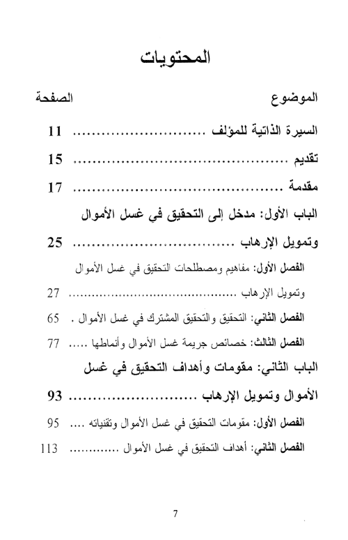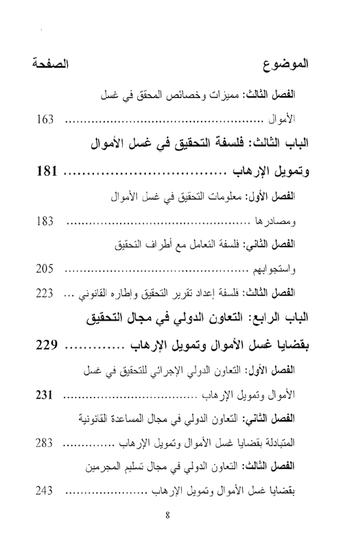 وتحقيقاً لأغراض هذا الكتاب وأهدافه، فقد استدرك تضمينه خمسة أبواب، يشكل الباب الأول مدخلاً إلى التحقيق في غسل الأموال وتمويل الإرهاب، بما يتضمنه من مفاهيم ومصطلحات، وأنواع التحقيق والتحقيق المشترك في غسل الأموال، وخصائص جريمة غسل الأموال وأنماطها.