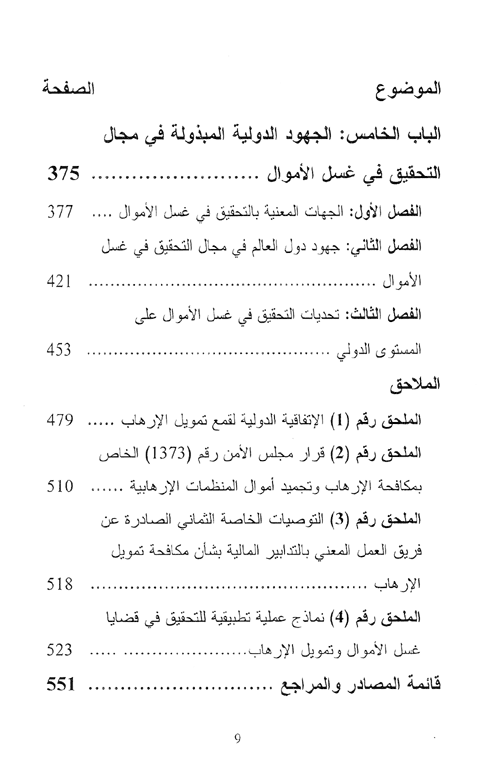 أما الباب الخامس والأخير، وعنوانه الجهود الدولية المبذولة في مجال التحقيق في غسل الأموال، فيتحدث عن الجهات المهنية في التحقيق بغسل الأموال، وجهود دول العالم في مجال التحقيق في غسل الأموال، وتحديات التحقيق في غسل الأموال على المستوى الدولي.