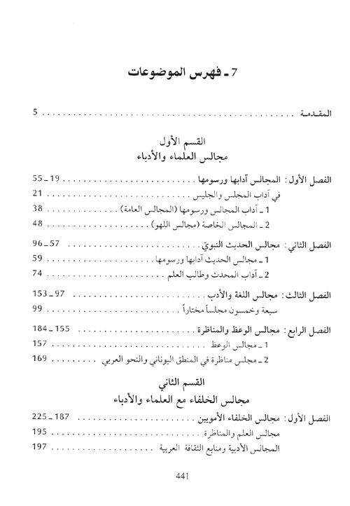 وهكذا فقد رسم لهذا الكتاب أن يكون على قسمين أو بابين، كل قسم في أربعة فصول يتناول القسم الأول مجالس العلماء والأدباء، والقسم الثاني يتحدث عن مجالس الخلفاء ومع العلماء والأدباء. وقد تناول الفصل الأول اذي اتخذ اسم: (المجالس آدابها ورسومها)، الحديث عن المجالس وكيف تكون سواء أكانت مجالس الخلفاء أم مجالس العلماء والأدباء. وقدم لهذا الفصل بالحديث عن ىداب المجلس والجليس، وتيمناً بما جاء عن رسول الله صلى الله عليه وسلم في ذكر المجالس وآدابها فقد بدأ بعرض ما جاء من أحاديث الرسول وأقوال الصحابة والجيل الأول في أصول المجالس وآدابها، من ذكر الجليس الصالح وآداب الجالسين، والسلام عند القدوم والاستئذان عند القيام، والتوسعة للقادم والجلوس من العلم والكلام الطيب، وضرورة الإصغاء للمحدث، وآدب السؤال والحوار. وكانت تعقد المجالس في قصور الخلفاء أو في بيوت العلماء، أو المساجد، ولا شك أن أكرم المجالس هي مجالس المساجد.