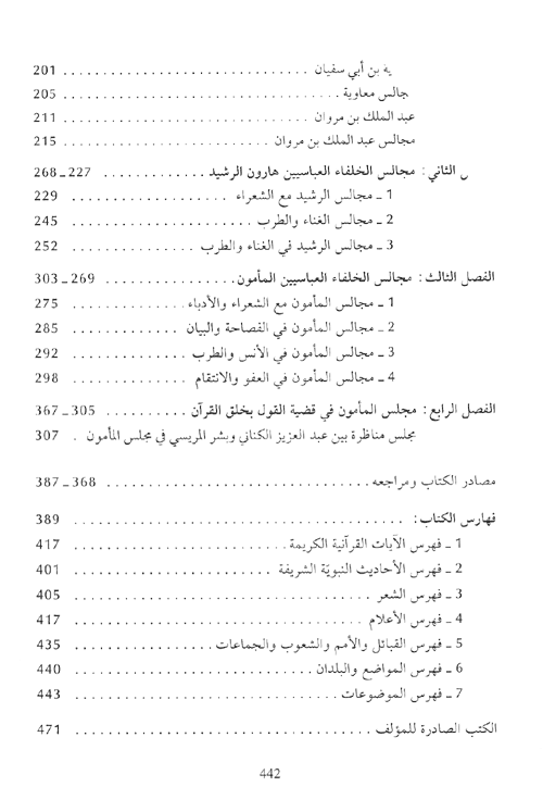 هذا ما حوته فصول القسم الأول من مجالس العلم، فأما فصول القسم الثاني فقد تناولت: (محالس الخلفاء مع العلماء والأدباء)، وقد تكفل الفصل الأول بمجالس الخلفاء الأمويين، وتحدث الفصل الثاني عن مجالس الخلفاء العباسيين، وكان أهم وأبرز هذه المجالس، مجالس هارون الرشيد، ثم مجالس ابنه المأمون. وتعهد هذا الفصل بالحديث عن مجالس الرشيد، مجالسه مع الشعراء، ثم مجالسه مع المغنين والمطربين. وتكفل الفصل الثالث بالحديث عن مجالس المأمون.