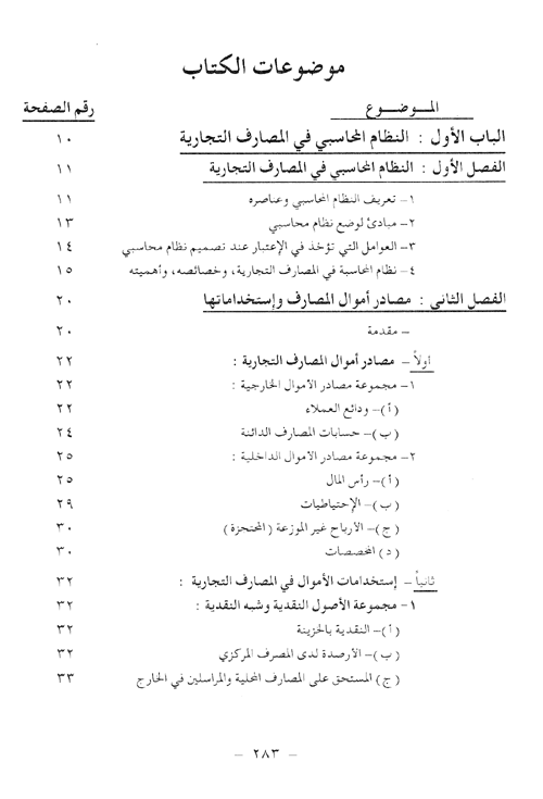 نبذة نيل وفرات:يتناول الكتاب الأساليب الحديثة لإدارة أعمال المصارف والمؤسسات المالية بما يمكنها من تحقيق أهدافها، وذلك على النحو التالي: الباب الأول: وتناول: النظام المحاسبي في المصارف والمؤسسات المالية كأساس لتوفير المعلومات والبيانات المالية الدقيقة والصحيحة والصادقة... وقد تم إيضاح ما يلي: تعريف النظام المحاسبي وعناصره، وخصائصه وأهميته في المصارف والمؤسسات ...المالية، ومبادئ وعوامل تصميم نظام محاسبي. مصادر الأموال واستخداماتها في المصارف (والمؤسسات المالية)، إيرادات ومصروفات المصارف التجارية (المؤسسات المالية)، مشروع النظام المحاسبي الموحد للمصارف التجارية العربية.