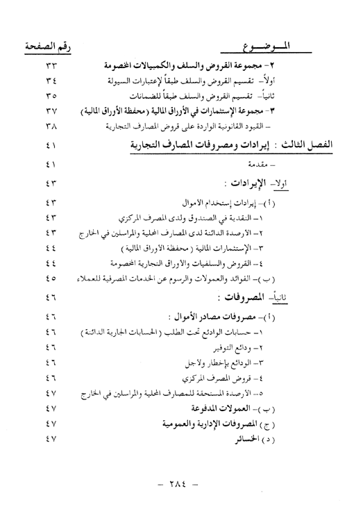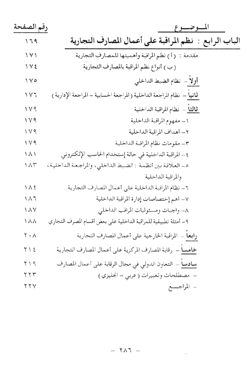 الباب الرابع: وتناول: نظم الرقابة على أعمال المصارف (والمؤسسات المالية) والتي تحقق لها سلامة تدفق الأموال وتوزيعها، وحماية أًولها وموجوداتها، وسلامة عملياتها ودقة تسجيلها، ومنع حدوث الغش والتنوير والاختلاس والأخطاء، واكتشافها، إذا ارتكبت، فور حدوثها وقبل أن يزداد ويستفحل أمرها... وقد تم إيضاح ما يلي: نظم المراقبة وأهميتها وأنواعها والعلاقات بينها: نظام الضبط الداخلي -نظم المراجعة الداخلية- نظام المراقبة الداخلية، مفهوم وأهداف ومقومات نظام المراقبة الداخلية، أهم اختصاصات إدارة المراقبة الداخلية، وواجبات ومسؤوليات المراقب الداخلي، أمثلة تطبيقية للمراقبة الداخلية على بعض إدارات وأقسام المصرف التجاري، المراقبة الخارجية على أعمال المصارف التجارية، رقابة المصارف المركزية على أعمال المصارف التجارية، التعاون الدولي في مجال الرقابة على أعمال المصارف.