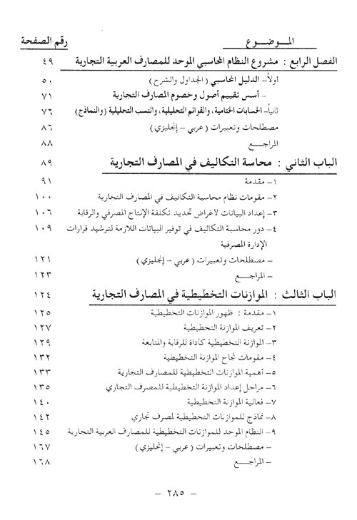 الباب الثالث: وتناول: الموازنات التخطيطية في المصارف (والمؤسسات المالية)... كأداة تساعد الإدارة في مجالات التخطيط والتنسيق والرقابة على جميع أنشطة المؤسسة، فهي تحدد التوقعات، وتضع المعايير لقياس الأداء الفعلي بالمقارنة مع الأداء المستهدفة، وتقييم الأداء وتصحيح المسار في الانحرافات السالبة، وتنمية الانحرافات الموجبة... وقد تم إيضاح ما يلي: تعريف الموازنة التخطيطية كأداة للرقابة والتخطيط والمتابعة والرقابة، مقومات نجاح الموازنة التخطيطية، وأهميتها للمصارف (والمؤسسات المالية)، وفعاليتها.، مراحل إعداد الموازنة التخطيطية، ونماذج لها، النظام الموحد للموازنات التخطيطية للمصارف التجارية العربية.
