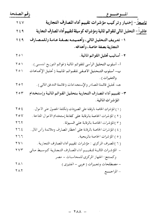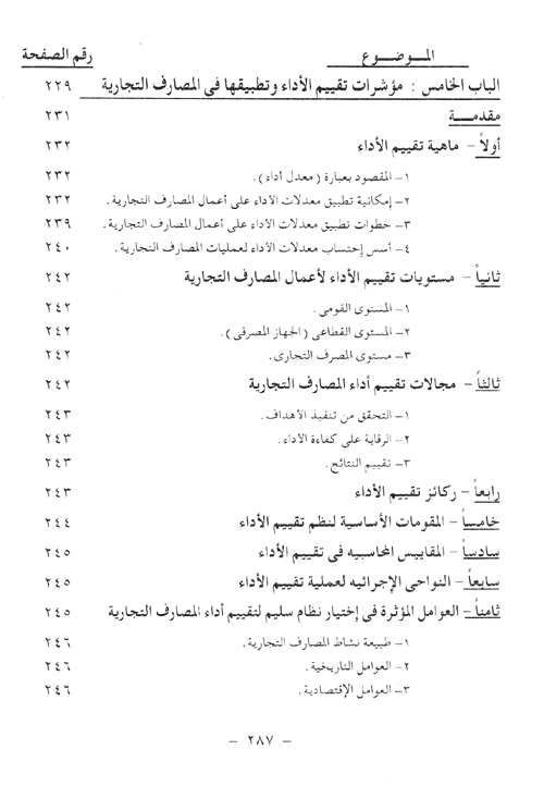 الباب الخامس: وتناول: مؤشرات تقييم الأداء للمصارف (والمؤسسات المالية) باعتبارها من أهم الوسائل التي يستخدمها علم الإدارة الحديث بهدف تحقيق الكفاءة في استخدام الموارد المتاحة في الاقتصاد القومي بما يرفع معدلات النمو الاقتصادي... وفي ظل التطورات الإقليمية والدولية على صعيد العمليات والتقنيات والأدوات أصبحت المصارف والمؤسسات المالية في وضع يحتم عليها أن تركز في نشاطها على أداء ونوعية العاملين فيها، بالإضافة إلى أن إدارة الموجودات والمطلوبات، وترشيد النفقات، وإدخال نظم علم وإدارة وحوافز لم يعد فقط ضرورة ملحة لمواكبة التطورات السائدة في المصارف والأسواق المالية الدولية ولمواجهة التحديات التي أفرزتها الأوضاع الاقتصادية المحلية والإقليمية، بل شرطاً للبقاء والاستمرار... ويفيد تطبيق معدلات الأداء في المصارف والمؤسسات المالية في حل الكثير من المشكلات منها: قياس القوى العاملة اللازمة للعمل -ترقية العاملين- رفع معدلات الأداء عن طريق التدريب، واستخدام التجهيزات الآلية، والاهتمام بالتنظيم الفني والإداري، والحوافز ووضع الشخص المناسب في المكان المناسب... وقد تم إيضاح ما يلي: ماهية تقييم ومعدلات الأداء، وإمكانية وخطوات تطبيقها على أعمال المصارف (والمؤسسات المالية)، وأسس احتسابها. مستويات تقييم الأداء: المستوى القومي -المستوى القطاعي- مستوى المصرف (والمؤسسة المالية)، مجالات تقييم الأداء: التحقق من تنفيذ الأهداف -الرقابة على كفاءة الأداء- تقييم النتائج، ركائز تقييم الأداء، المقومات الأساسية لنظم تقييم الداء، المقاييس المحاسبية والنواحي الإجرائية لعملية تقييم الأداء، العوامل المؤثرة في اختيار نظام سليم لتقييم الأداء، واختيار تركيب مؤشرات تقييم الأداء، التحليل المالي للقوائم ومؤشراته كوسيلة لتقييم أداء المصارف (والمؤسسات المالية).