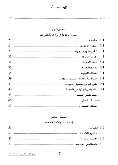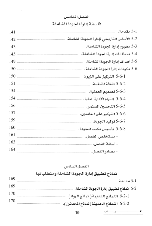 بينما تضمن الفصل الخامس فلسفة الجودة الشاملة، من حيث مفهومها وتطورها التاريخي، ومنطلقاتها، وأهدافها ومكوناتها المختلفة. وخصص الفصل السادس لنماذج تطبيق الجودة الشاملة في منظمات الخدمة، ومبررات تطبيقها، والفوائد التي يمكن تحقيقها من جراء عملية التطبيق، ومتطلباتها ومراحلها. فيما جاء الفصل السابع ليلقي الضوء على فلسفة التحسين المستمر من حيث مفهومها والمداخل المعتمدة لتعريفها، ومتطلبات تحسين العملية ونماذج تطبيقها في بيئة عمليات الخدمة.