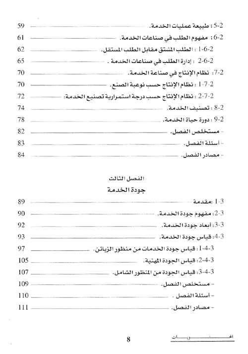 بينما خصص الفصل الثاني لموضوع إدارة عمليات الخدمة، من حيث مفهوم الخدمة، وخصائصها، وكيفية إدارة عملياتها وما هي نظم تقديمها للزبون، وأصنافها المختلفة.
