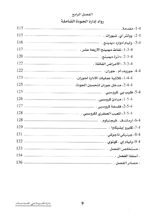 وقد اشتمل الفصل الثالث على جودة الخدمة، من حيث المفهوم وتحديد الأبعاد، والأهداف والأهمية، وكيفية قياس جودة الخدمات. بينما خصص الفصل الرابع لرواد الجودة والتي لا يمكن فهم فلسفة الجودة الشاملة ما لم يتم الإطلاع على ما قدموه علماء الجودة من أمثال ديمينج، كروسبي، إيشيكاوا، جوران، وغيرهم من إعمال رائدة ساهمت في تطوير وتجسيد فلسفة الجودة الشاملة في بيئة منظمات الصناعة والخدمات.