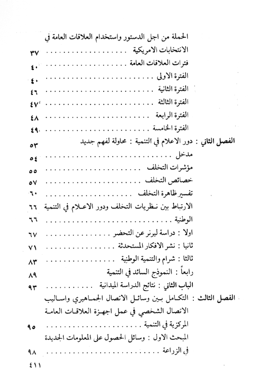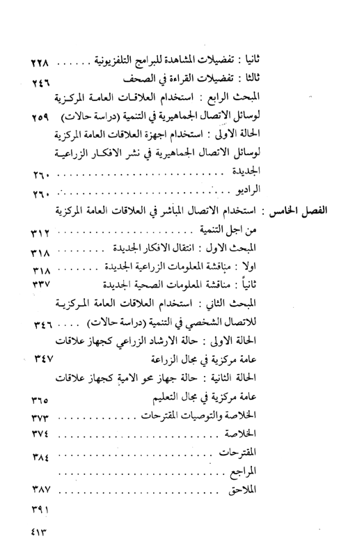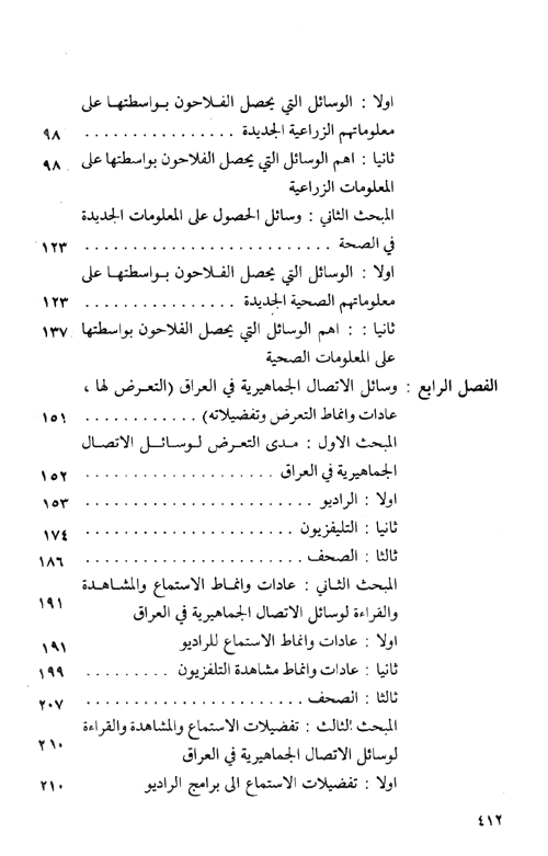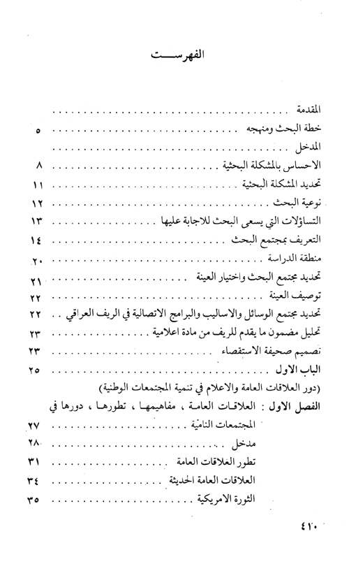 نبذة نيل وفرات:يثير هذا البحث عدداً من التساؤلات التي يحاول الإجابة عنها، والتي يمكن تحديدها فيما يلي: 1-مدى تطابق المفاهيم الغربية لدور الإعلام في العالم الثالث مع واقعه. 2-طبيعة التماثل القائم بين عمل أجهزة الأعلام العامة في العالم النامي وأجهزة العلاقات العامة في العالم المتقدم. 3-مدى انتشار أجهزة الاتصال الجماهيرية (الراديو، ...التلفزيون، الصحف) في الريف العراقي. 4-مدى تعرض أبناء الريف لأجهزة الاتصال الجماهيرية. 5-أنماط الاستماع والمشاهدة والقراءة لوسائل الاتصال الجماهيرية في الريف. 6-تفضيلات الاستماع والمشاهدة والقراءة لوسائل الاتصال الجماهيرية في الريف. 7-أنماط الاستماع والمشاهد والقراءة لوسائل الاتصال الجماهيرية في الريف. 8-مدى التكامل ما بين وسائل الاتصال الجماهيرية والاتصال الشخصي في الحصول على المعلومات الجديدة في الزراعة والصحة. 9-مدى الاستماع لبرامج الريفية الزراعية والصحية بين الفلاحين. 10-مدى مشاهدة البرامج الزراعية والصحية في التلفزيون بين الفلاحين. 11-مدى قراءة صحيفة "صوت الفلاح" في الريف. 12-حجم ومضمون المادة الزراعية التي تتضمنها وسائل الاتصال الجماهيرية. 13-مدى الأثر الذي تتركه المادة الزراعية المقدمة من خلال الراديو في الفلاح. 14-مدى الاستفادة من مضمون المعلومات التي تقدمها دائرة الإرشاد الزراعي. 15-حجم ومضمون المادة الزراعية والإرشادية والصحية في كتب محو الأمية. 16-مدى الاستفادة من المادة الزراعية والإرشادية والصحية التي تتضمنها كتب محو الأمية. إقرأ المزيد