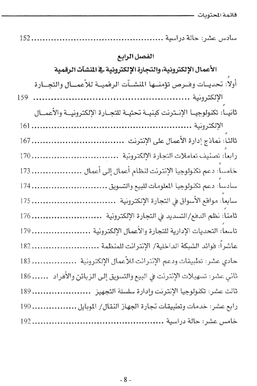 أما الفصل الرابع فقد تم تكريسه لأنواع نظم المعلومات من حيث المستويات الوظيفية والتخصصات الموضوعية، لتحديات إدارية والفرص التي تؤمنها المشاريع الرقمية للتجارة الإلكترونية، والأعمال الإلكترونية، وتكنولوجيا الإنترنت كبنية تحتية للتجارة الإلكترونية، والأعمال الإلكترونية، ونظم الدفع/التسديد في التجارة الإلكترونية، والتحديات الإدارية للتجارة والأعمال الإلكترونية على الإنترنت، وفوائد الإنترنت للمنظمة، وتسهيلات الإنترنت في البيع والتسويق إلى الزبائن الأفراد، وتكنولوجيا الإنترنت وإدارة سلسلة التجهيز وغيرها...