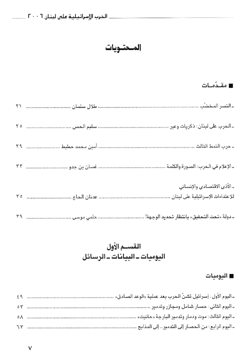 نبذة الناشر:يضمّ هذا الكتاب سجلات الحرب الإسرائيلية على لبنان تموز/يوليو 2006 مبيّنة باليوميات الدقيقة، وموثّقة بالبيانات والخرائط والصور.