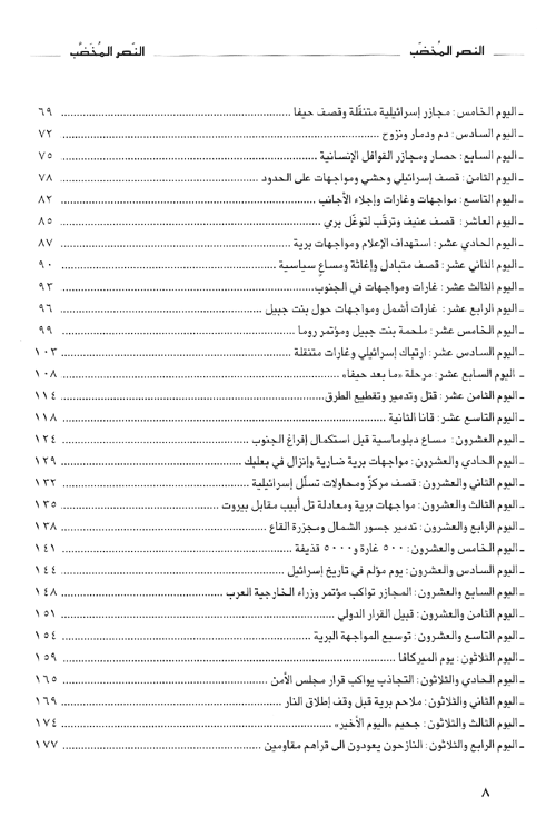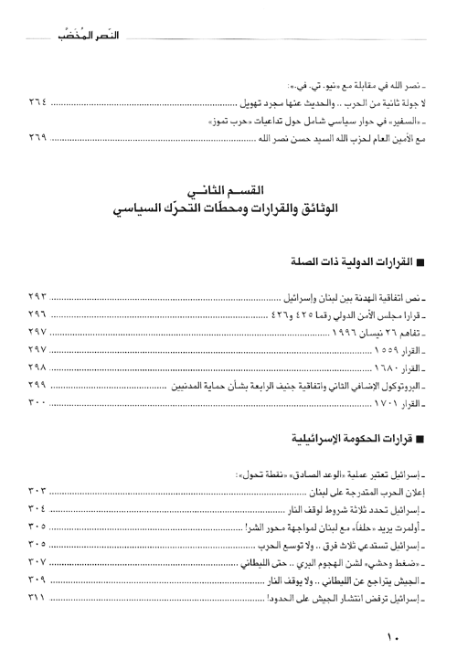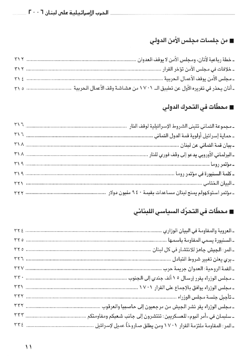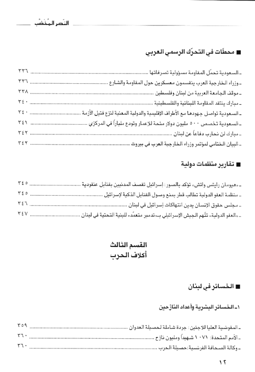 ويشتمل على وقائع الوضع العسكري الميداني، ومحطات التحرّك السياسي الدولي والعربي واللبناني على الصعيدين الرسمي والشعبي وعلى الأكلاف والخسائر والأضرار البشرية والمادية والمعنوية مؤيّدة بالجداول والتقارير لدى طرفي الحرب، ويواكب الحركة السياسية كما تبدّت ...في الصحافة اللبنانية والعربية والأجنبية.