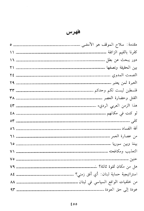وهكذا يمضي الدكتور الحص في بيان مكامن الخطأ في الممارسات السياسية ليس فحسب على الصعيد اللبناني، بل على الصعيد العالمي منطلقاً من خبرة في المجال السياسي على مدى أكثر من ثلاثين عاماً وذلك قبل توليه رائسة الوزارة للمرة الأولى في عام 1976. يمضي في استشفافاته السياسية القائمة على الوطنية الحقة والنزاهة والأمانة في ابتداء الرأي الذي يخدم الوطن ومصلحته فقط وذلك ضمن سلسلة من المقالات والبيانات ضمّها هذا الكتاب تحت عنوان معبو "سلاح الوطن".نبذة الناشر:لا يلجأ إلى العنف إلا فاقد القضية، ولا يلجأ إلى سلاح الموقف إلا المطمئن إلى منعة قضيته، ولكن سلاح الموقف لا يكون فاعلاً ماضياً إلا إذا كان مشفوعاً بقوة الحق وقوة الشرعية وقوة الإرادة الموحدة. ومن لا يجد سوى العنف الماحق إنما هو ذاك الذي تعوزه ذخائر الحق والشرعية ووحدة الإرادة الوطنية.
