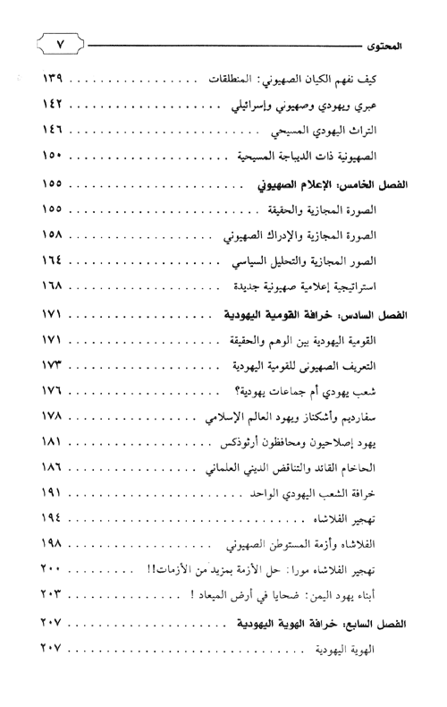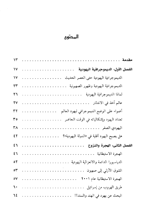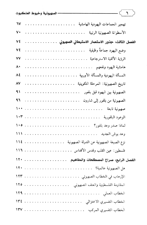 وتتسم هذه المقالات بأنها مستقلة بعضها عن بعضن ومع هذا يمكن تصنفها بقدر المستطاع في إطار الموضوعات الأساسية الكامنة فيها. فعلى سبيل المثال تتناول الفصول الأولى الموضوعات التي تدور حول بعض جوانب ...الاستعمار الصهيوني، فيحمل الفصل الأول عنوان "الديموغرافية اليهودية"، أما الفصل الثاني فعنوانه "الهجرة والنزوح"، والثالث عنوانه "جذور الاستعمار الاستيطاني الصهيوني"، وتنتقل الدراسة في الفصل الرابع "صراع المصطلحات والمفاهيم" إلى قضية المصطلح الصهيوني وكيف أنه يعبر عن مفاهيم صهيونية وضرورة الحذر منه، ويطرح هذا الفصل خطاباً تحليلياً مركباً، قادراً على تفسير كثير من جوانب الظاهرة الصهيونية دون اختزالها. والموضوع الذي يتناوله الفصل الخامس (ألإعلام الصهيوني) ليس بعيداً تماماً عن موضوع المصطلح الصهيوني والخطاب التحليلي، إذ يحاول هذا الفصل أن يحلل بعض الصور المجازية المتواترة في الخطاب الصهيوني، كما يحاول أن يبين بعض الاتجاهات الجديدة في الإعلام الصهيوني. وننتقل في الفصول التالية (السادس: خرافة القومية اليهودية"، والسابع: "خرافة الهوية اليهودية"، والثامن: خرافة الشخصية اليهودية"، والتاسع: "ثقافات الجماعات اليهودية" إلى مفهوم الوحدة اليهودية، وهي المفهوم المحوري في الإيديولوجية الصهيونية. وتحاول هذه الفصول أن تبين من خلال الأمثلة المحددة والشواهد المتعددة أنه لا يوجد أي تجانس بين أعضاء الجماعات اليهودية، وأن الحديث عن الوحدة اليهودية هو خرافة ابتدعها الصهاينة والمعادون لليهود واليهودية على حد سواء لإسباغ الشرعية على المشروع الصهيوني.