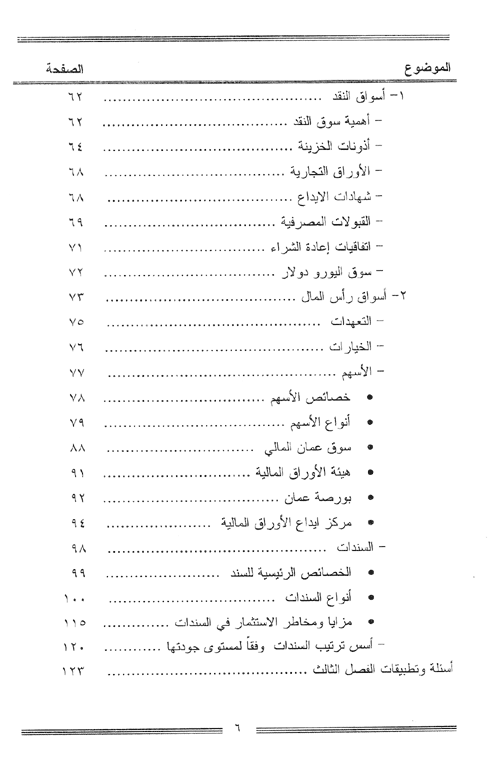 أما الفصل الثاني فيعرض لطرق قياس العائد، والمخاطرة للأوراق المالية، بالإضافة إلى التعريف بأنواع مخاطر الاستثمار، مثل مخاطر سعر الفائدة ومخاطر التضخم ومخاطر الإدارة. ويتناول الفصل الثالث أهم الأدوات المختلفة المتاحة للمستثمر في أسواق النقد وأسواق رأس المال مع التعريف بالخصائص الأساسية لهذه الأدوات ودرجة المخاطرة والعائد في كل منها. كما يشتمل هذا الفصل على جزء خاص بأحدث التطورات في السوق المالي الأردني حسب قانون ألأوراق المالية رقم 76 لعام 2002، خاصة ما يتعلق منها ببورصة عمان، وهيئة الأوراق المالية، ومركز إيداع الأوراق المالية.