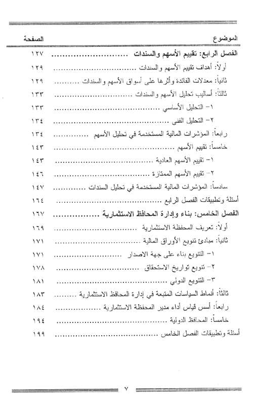 أما الفصل الرابع فيركز على تحليل وتقييم الأسهم والسندات باعتبارهما أهم الأوراق المالية المتاحة للاستثمارات في السوق الأردني، فبالإضافة إلى تحليل خصائص وأنواع الأسهم و السندات، يعرض الفصل الأساليب المتبعة في تقييم هذه الأوراق المالية لأغراض الاساثمار. ويضع الفصل الخامس الإطار العام لعملية بناء المحافظ الاستثمارية، من حيث الاستراتيجيات المتبعة في بناء المحافظ وأنواع السياسات المتبعة في إدارة المحافظ وأسس تقييم أدائها.