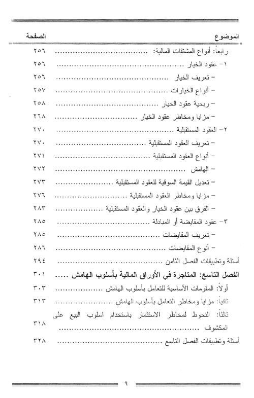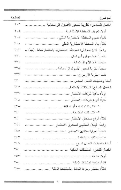ويبحث الفصل الثامن في أسواق عقود الخيارات والمستقبليات وعقود المقايضة وهي من أدوات الاستثمار الحديثة نسبياً. ويعرض هذا الفصل لآلية عمل هذه الأسواق كأداة استثمار، والأهداف المرجوة من الاستثمار فيها. أما الفصل التاسع والأخير فيعتبر امتداداً للفصول المتعلقة بالأسواق المالية في الفصلين الثالث والرابع، فيتعرض بالتحليل لأحد أساليب الاستثمار في هذه الأسواق وهو المتاجرة بأسلوب الهامش، من حيث مقوماته الأساسية، المزيا والمخاطر المرتبطة به، وطرق التخوط لمخاطر التعامل بهذا الأسلوب. إقرأ المزيد