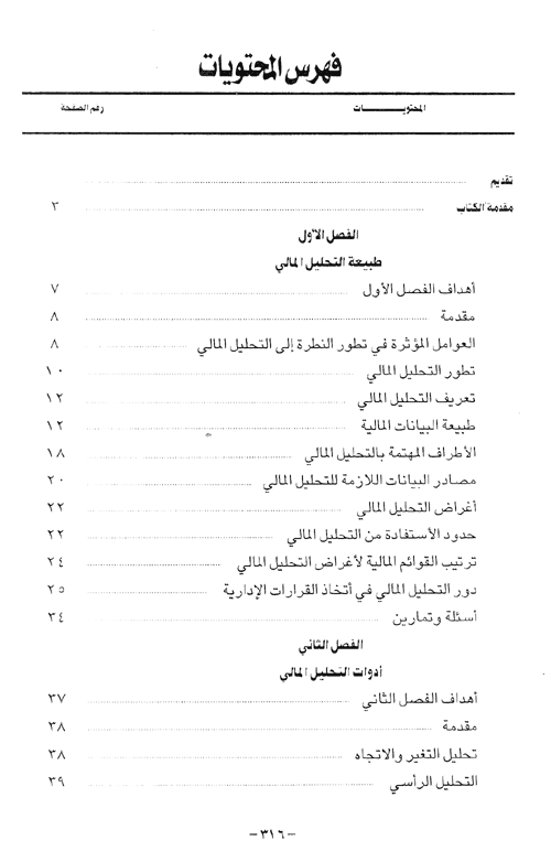 تضمن الكتاب تسعة فصول حاولت تغطية معظم جوانب التحليل المالي الأساسية والتي غالباً ما يكون طالب الدراسات الجامعية الأولية بحاجة إليها، معززة بأمثلة وتطبيقات ومجموعة من التمارين التي تعزز فهمه للموضوع وتوسع مداركه في المجالات التطبيقية. ويتضمن الفصل الأول، وهو بعنوان "طبيعة التحليل المالي" توضيحاً لمفهوم التحليل المالي وتطوره والأهداف المتوخاة منه والجهات المتوقع استفادتها من نتائجه، ومصادر البيانات الداخلية والخارجية التي يستند إليها في الوصول إلى استنتاجاته وتوصياته محاولين ربط التحليل المالي ووظائفة بعملية صناعة القرارات الإدارية في المجالات المختلفة، وكذلك محددات التحليل المالي والدور الذي يلعبه في ترشيد قرارات التشغيل والاستثمار والتمويل.