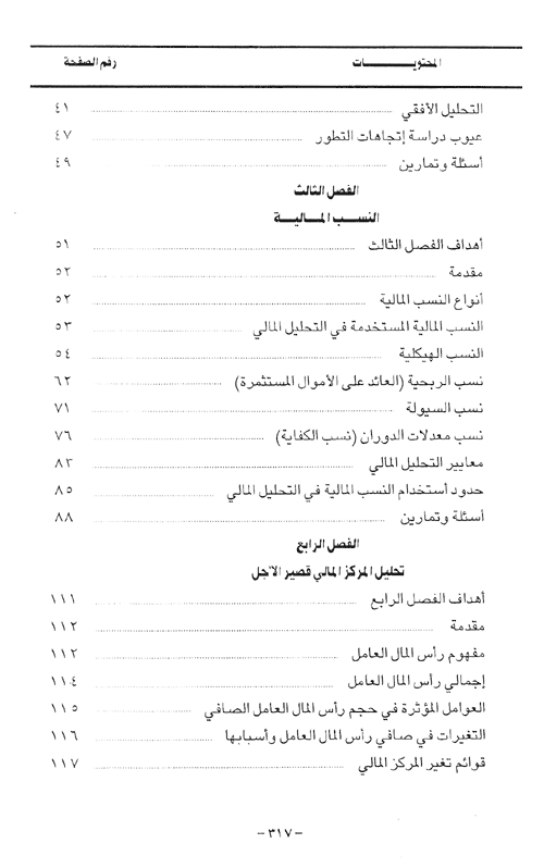 أما الفصل الرابع، وهو بعنوان "تحليل المركز المالي قصير الأجل" فقد تناول موضوع تحليل المركز المالي قصير الأجل للمنشأة ويتضمن الفصل مناقشة العوامل المؤثرة في راس المال العامل الصافي وإجمالي رأس المال العامل وأهمية كل منهما للحفاظ على السيولة النقدية في المنشأ ومقومات المركز المالي قصير الأجل الذي يمثل الحالة المثلى للمنشأة.