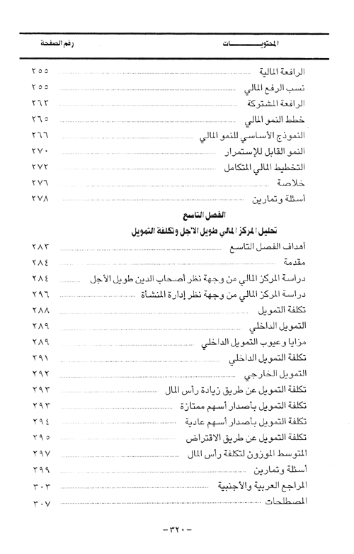 أما الفصل التاسع فإنه يعالج، موضوع "التحليل المالي لأغراض التمويل" حيث يناقش بالتفصيل الأساليب والأدوات التي يمكن للتحليل المالي توفيرها لصانع القرار فيما يتعلق بسياسات التمويل المناسبة وكيفية تقدير الاحتياجات التمويلية وبناء الهيكل الأمثل لرأس المال المستثمر.نبذة الناشر:يهدف هذا الكتاب إلى سد بعض النقص الحاصل في مصادر التحليل المالي وكتبه وهو في هذا يشكل لبنة في بناء هذا الباب، إذ صيغت فصول هذا الكتاب بشكل مبسط يسهل على طلبة الدراسات الأولية في أقسام المحاسبة والادارة والدراسات المالية والمصرفية الانتفاع منه، كما توسع في فصوله الأخيرة بالشكل الذي يمكن الانتفاع منه في الدراسات الأكثر تقدماً، حيث تناول الكتاب لتحقيق هذا الهدف، طبيعة التحليل المالي وأدواته، والتحليل المالي باستخدام النسب المالية وتحليل المركز المالي قصير الأجل، وتناول كذلك استخدام التحليل المالي في التنبؤ بالفشل وتحليل فاعلية الأعمال ودرجة الرافعة، وغيرها من المواضيع الدقيقة والمتخصصة في هذا المجال. إقرأ المزيد