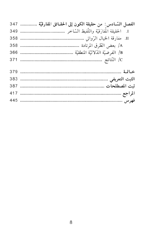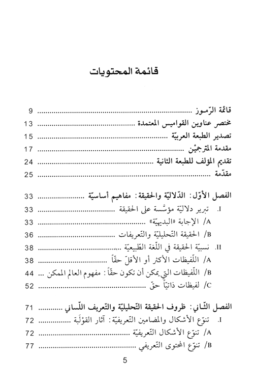 نبذة الناشر:يستعيد مارتان في هذا الكتاب الفكرة المركزية القائلة بأن مفهوم الحقيقة هو أحد مفاتيح الاشتغال الدلالي، ليستقصي فضلها في تأسيس دلالية تخضع أكثر من سواها لمقتضيات الحساب والشكلنة، موضحاً عدداً من ألآليات اللسانية بالمقاربة المسماة "ظروف الحقيقة".