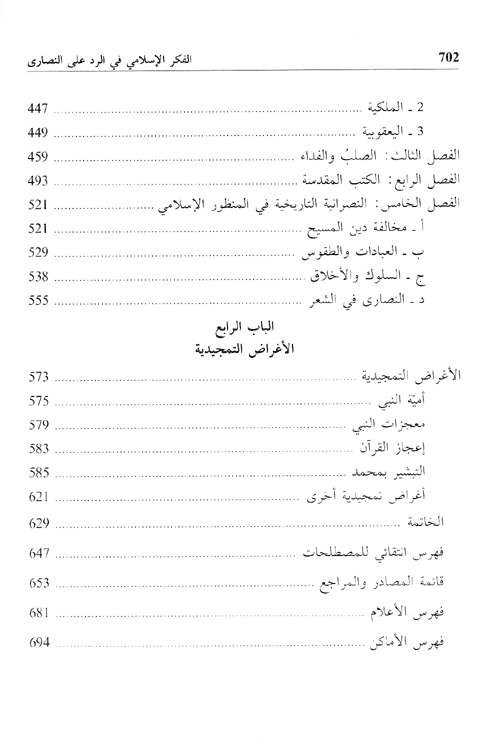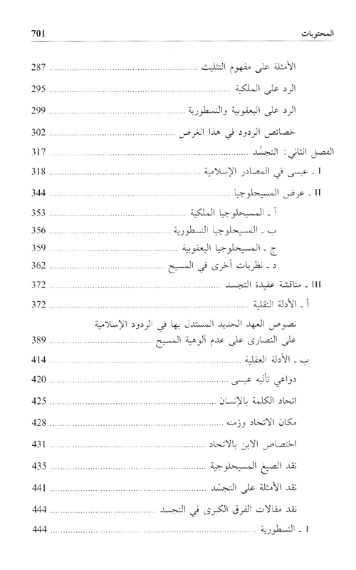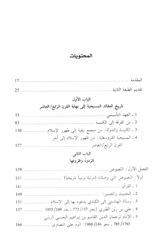 نبذة نيل وفرات:لم تنفك المسيحية تشغل حيّزاً على حدّة من اهتمامات المسلمين منذ خرجوا من الحجاز، مهد الإسلام، إلى الشام، والعراق وبلاد فارس وغيرها. فلقد اتصل الفاتحون العرب بجاليات نصرانية أهلية عريقة في منطقة الشرقين الأدنى والأوسط وفي شمال أفريقيا واسبانيا مدة الحكم الإسلامي للأندلس تعين عليهم التعامل معها والتعايش، وكانت ...الحرب سجالاً مع الأمبراطورية البيزنطية الى أن انتهت بسقوط القسطنطينية، كما كانت الحروب مع القوى الأوروبية في إيطاليا وجنوب فرنسا ثم في فلسطين والشام زمن الحملات الصليبية مظهراً آخر من مظاهر العلاقات بين المسلمين والنصارى واستمر الصراع في العصور الحديثة بين الخلافة العثمانية والممالك النصرانية وامتد مع المد الإستعماري العربي منذ القرن الماضي وما صاحبه من "تبشير" وقح. وعلى صعيد آخر، كان التجذر التاريخي للإيمان المسيحي على امتداد ستة قرون سابقة للرسالة المحمدية، وادعاء المسيحية الإنتساب الى الوحي النهائي الأكمل، وصبغتها التبشيرية والكونية عوامل تهيئها للتصادم مع الإسلام في توقه الى استيعاب الأديان التي ظهرت قبله وتجاوزها وجمع شتات الموحدين على اختلاف أجناسهم وألوانهم تحت راية رسالة خاتم الأنبياء. لم يكن الجدل العقائدي إذن عملاً ذهنياً مجانياً البتة، بل كان سلاحاً نضالياً لبلوغ أغراض دينية ودنيوية معاً. كان يستجيب لضرورة الدفاع عن النفس ودعم تماسك البنية الإجتماعية القائمة، ويستجيب في الآن نفسه لمقتضيات الحرب النفسانية وما تتطلبه من زرع بذور الشك عند الطرف المقابل على أمل حمله على اختيار ما يعتقد أنه الحل الصحيح والإلتحاق بصف المدافعين عن الحق والخير. كما كان ذاك الجدل معبراً بصفته ضمنية عن قيمة الدين المطعون فيه وقدرته على الاغراء وما يمثله من تحدّ في نظر الداعين بأهميته. ضمن هذا الإطار تأتي هذه الدراسة التي هي في الأصل أطروحة تقدم بها الباحث لنيل درجة الدكتوراه. وان الميدان الذي كان موضع الإهتمام في هذا العمل انما هو منطقة حدودية بين دينين، ولأنها كذلك فهي معرضة بطبيعتها الى تقلبات ظرفية قد تجعل التأثير المتبادل يسيراً وعامل اثراء للطرفين في بعض الأحيان، وقد تقيم الحواجز بينها وتسعى الى فرض المرور في اتجاه واحد أحياناً أخرى وفي فترات التأزم خصوصاً، وأدت المجادلات الدينية تاريخياً الدور الثاني وساهمت في تصلب المواقف من الجانبين. كانت هذه المجادلات من الجانب الإسلامي تسمى في العادة "رداً على النصارى". وليس معنى ذلك أن هؤلاء قد هاجموا الإسلام بالضرورة فانبرى المسلمون للرد عليهم، بل هو فن "كلامي" قد يندرج ضمن باب التوحيد في المؤلفات الكلامية عموماً، وقد تخصص له كتب أو رسائل مفردة. والغرض منه في كلتا الحالتين دحض العقائد النصرانية، وكثيراً ما يكون موجهاً الى المسلمين في الدرجة الأولى لتثبيت عقيدتهم وتحذيرهم من ضلال النصارى وتضليلهم، وان احتوى على الدعوة الى اعتناق الإسلام والعزوف عن النصرانية. هذا وان مواضيع الجدل قد تحددت بصفة شبه نهائية (إذا تم استثناء الجدل الإسلامي – المسيحي الحديث أي منذ منتصف القرن الثالث عشر/ التاسع عشر) في أواخر القرن الرابع هجري/ العاشر ميلادي، واستقرت أغراضه الكبرى وسماته المميزة على نحو أغنى الباحث عن تتبع ما كتب في هذا المجال بعد هذا التاريخ. إذ الهدف الذي يرمي إليه هو تبين خصائص الفكر الإسلامي الكلاسيكي في صلته بالمسيحية، واستجلاء مدى تحقيق المجادلات للغرض الذي وضعت من أجله، والبحث عن النتائج التي من شأنها أن تترتب عليها. ذلك أن الصبغة النفعية المباشرة التي اختصت بها الردود فرضت على الباحث تقييمها على أساسها، دون اعتبار المجهود الفكري الذي بذله المسلمون حين سعوا الى معرفة كتب النصارى وعقائدهم عملاً مجرداً لإرضاء نهم عقلي أو حب في الإطلاع فحسب، وتأكد عليه الإنتباه الى أن الأغراض الجدلية والتمجيدية تنطوي على قيم وجودية لا سبيل الى انكارها كانت تضفي المعنى على الحياة والموت والمبدأ والمع