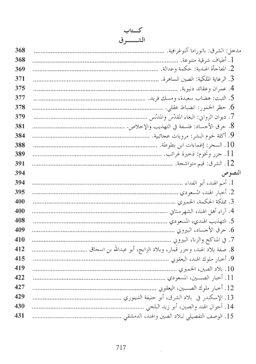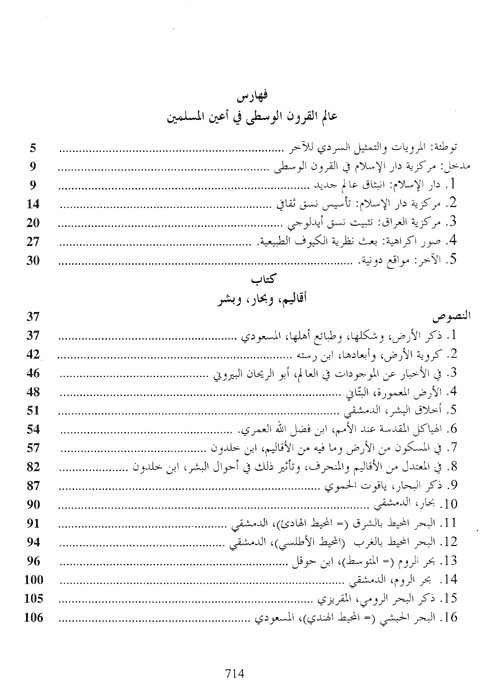 لعل أكثر ما حرص هذا الكتاب على صونه، هو: إيراد نصوص متكاملة، ومتنوعة، ومطولة، ومستوفية الشروطـ تضافرت فيما بينها لكشف مختلف الأوجه للعالم خارج دار السلام طوال القرون الوسطى, وكان ذلك العالم يحي بدار الإسلام من جميع الجهات تقريباً، وقد خصت أقوام الشرق والشمال والجنوب بأجزاء خاصة بها ضمن هذا الكتاب، لأن نظرة المسلمين لهم تباينت تبعاً لتباين المنظومات الثقافية التي ينتمون إليها، وتبعاً لمناطقهم الجغرافية وأعراقهم أيضاً.