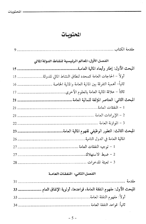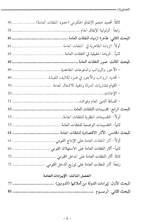 الفصل الثاني: فلقد بحث موضوع النفقات العامة ومفهومها وكيفية تحديدها. وقواعد النفقة العامة، وأولوية الإنفاق العام، ثم التعرض إلى ظاهرة زيادة الإنفاق العام والآثار الاقتصادية للنفقات العامة على الإنتاج القومي والدخل القومي وعلى توزيع الدخل القومي.