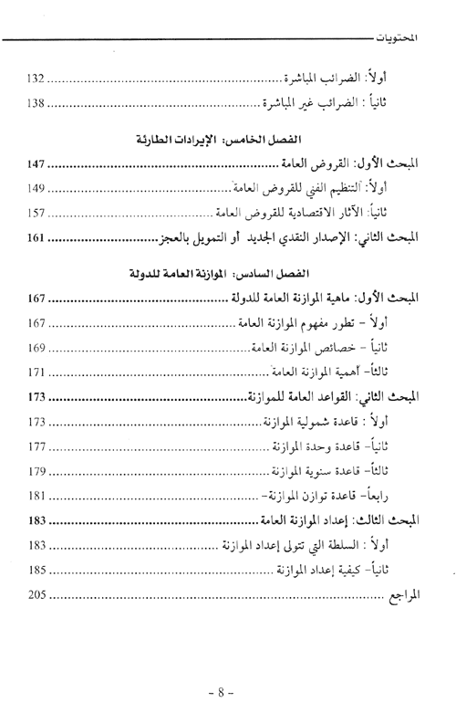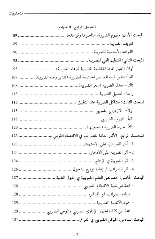 الفصل الرابع: بحث موضوع الضرائب، عناصرها وقواعدها والتنظيم الفني للضريبة والتهرب الضريبي والآثار العامة للضريبة في الاقتصاد القومي. ومن ثم عرج على النظم الضريبية في الدول النامية وأخيراً الضرائب في العراق.