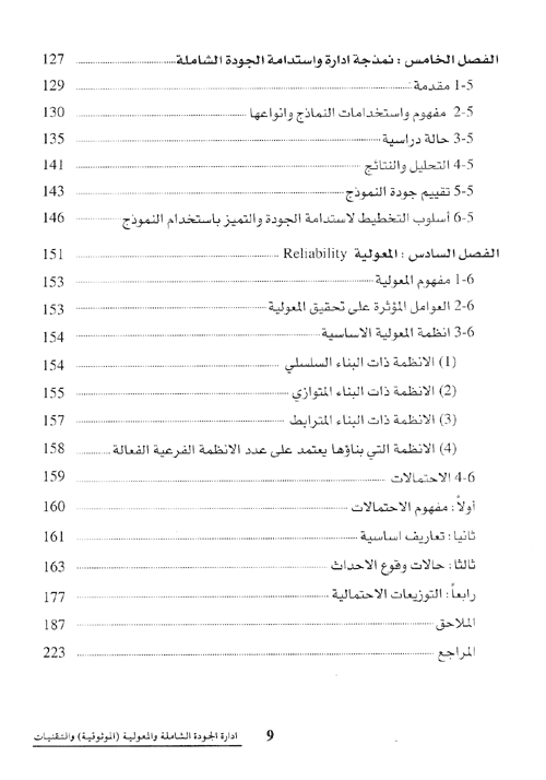 وقد عرج الفصل الأخير من الكتاب إلى مفهوم المعولية أو الموثوقية وأساليب تطبيقها. ويعود سبب إضافة هذا الموضوع إلى وجود العلاقة الوثيقة بين الجودة والمعولية، والفرق بينهما هو أن إنجازية الجودة تكون عند نقطة زمنية محددة، في حين أن إنجازيه المعولية هي الجودة على المدى البعيد. إقرأ المزيد
