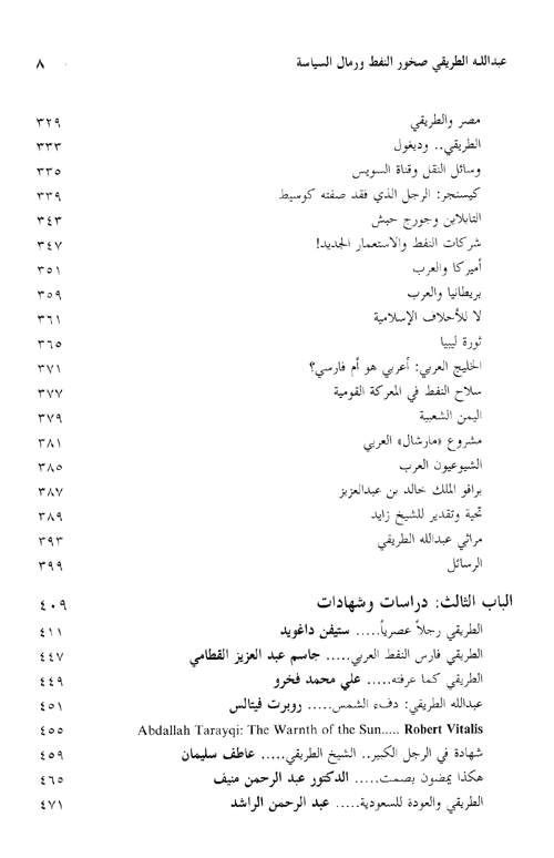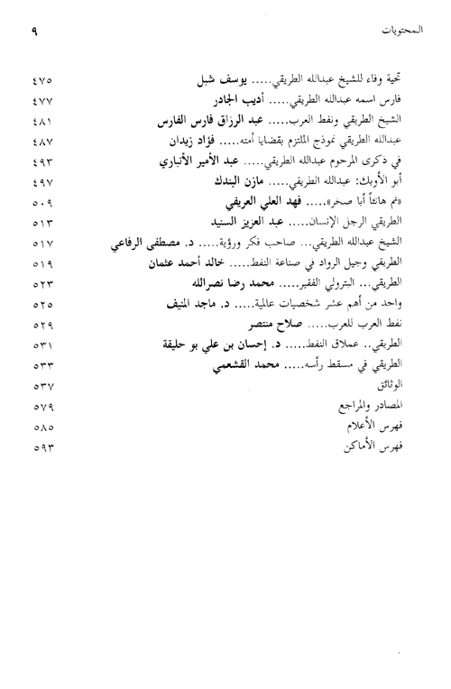 وما يسعى إليه هذا الكتاب هو الكشف عن جوانب مهمة من حياة عبد الله الطريقي، وذلك من خلال دراسة كافة المقالات الصحفية التي تضمنت إشارات إليه، هذا إلى جانب الكتب التي تناولته أو عرض لشيء من إنجازاته، ولا يخفى الدور الذي لعبه الأصدقاء والزملاء للشيخ الطريقي في الكشف عن حياته الخاصة والعامة، والهدف من ذلك كله هو كتابة وتوثيق سيرته ومسيرته، وعرض رحلته العلمية والعملية، التي بلغت الثمانين عاماً، بكل ما تحقق فيها من منجزات وإنجازات، وما تخللها من طموحات، وما أحاط بها من خيبة آمال، فكان هذا الكتاب الذي قسم إلى أبواب ثلاثة: الباب الأول: ويتضمن سيرته ومسيرته من مولده حتى وفاته. الباب الثاني: ويتضمن آراءه وأفكاره ورؤاه، التي طرحها ونشرها في مجلته. الباب الثالث: ويتضمن بعض الشهادات والدراسات التي كتبت عن عبد الله الطريقي، إما بعد وفاته أو بطلب من كاتب السيرة. والتي رأى كاتب السيرة أهمية تضمينها الكتاب. كما أفرد ملحقاً خاصاً بالوثائق.نبذة الناشر:يسلط الكتاب الضوء على بدايات صناعة النفط العربي وظروف نشأة وعي فكري بترولي في المنطقة، من خلال تناول سيرة أحد الآباء المؤسسين في صناعة النفط العربي، وأحد أبرز دعاة تحرير الثروات العربية القومية، من خلال مقاومة احتكار شركات النفط الأجنبية لامتيازاتها النفطية في المنطقة العربية.