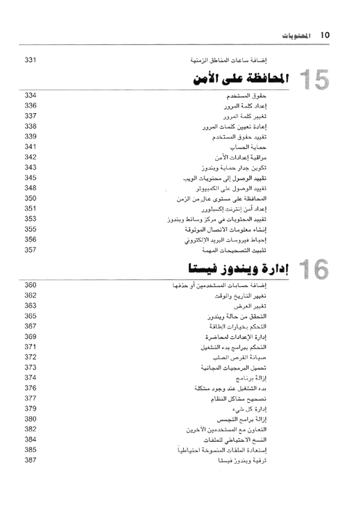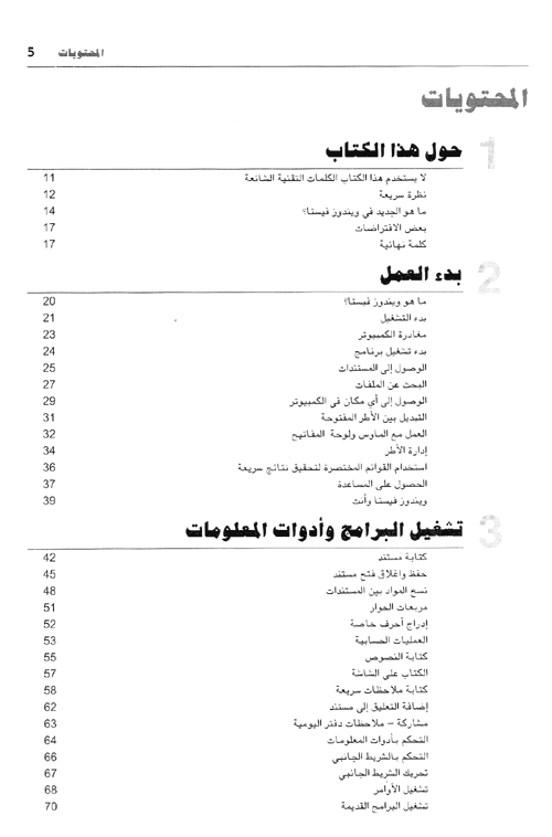 وبالعودة للمواضيع المطروحة في هذا الكتاب نجدها مقسمة وفقاً لما يلي: يغطي القسم 2 المبادئ الأساسية: تشغيل ويندوز فيستا وإغلاقه وتبديل المستخدمين بدون الحاجة إلى إغلاق الكمبيوتر وبدء البرامج والعمل مع أطر البرامج واستخدام قوائم الاختصار مع الماوس ولوحة المفاتيح والحصول على المساعدة عند اللزوم.