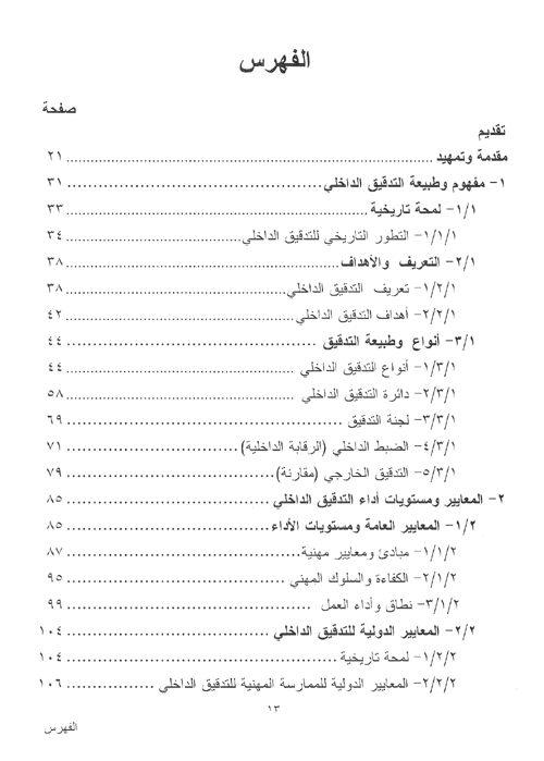 2-المعايير ومستويات أداء التدقيق الداخلي: تم التطرق في هذا الجزء إلى المعايير العامة ومستويات الأداء، وإلى المعايير الدولية للتدقيق الداخلي، وتم الاهتمام بإيراد أسئلة مكررة والإجابة عليها حول التدقيق الداخلي بالإضافة إلى قائمة بالمصطلحات المهنية،وحوكمة الشركات ولجنة بازل، ومعايير دولية ذات علاقة.