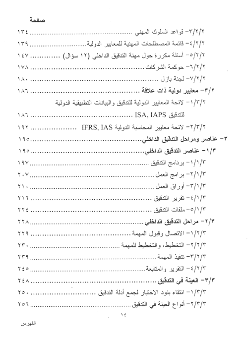 3-عناصر ومراحل التدقيق الداخلي: يتضمن برامج وأوراق العمل وملفات وتقرير التدقيق كما يتضمن مراحل عملية التدقيق، والعينة في التدقيق.