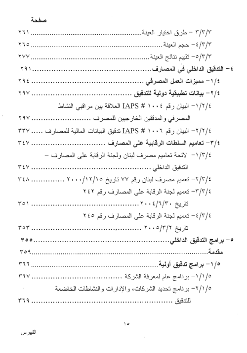 4-التدقيق الداخلي في المصارف: تم التطرق في هذا الجزء إلى مميزات العمل المصرفي وتم اختيار بيانين من بيانات ممارسة التدقيق الدولية وهما: بيان العلاقة بين مراقبي النشاط المصرفي والمدققين الخارجيين للمصرف، وبيان تدقيق البيانات المالية للمصارف إضافة إلى تعاميم السلطات الرقابية على المصارف ذات العلاقة في لبنان.