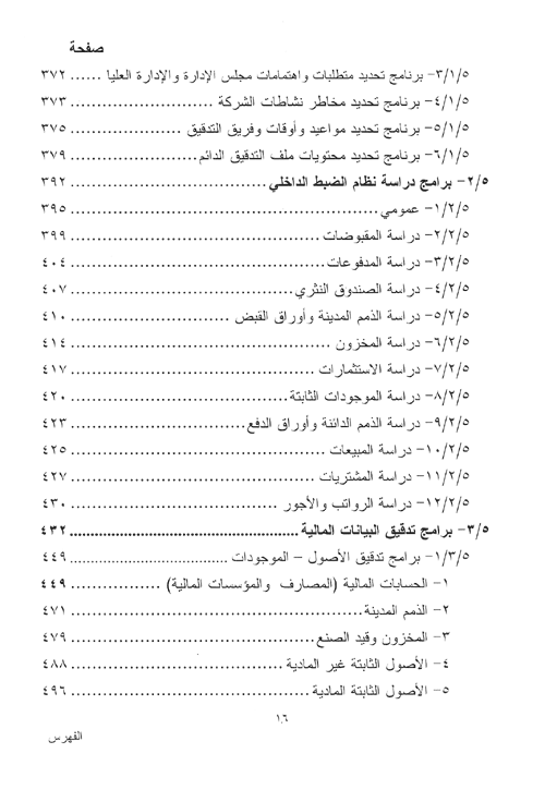 5-برامج التدقيق الداخلي: يحتوي هذا الجزء بالتفصيل أنواعاً من برامج التدقيق العملية منها: برامج التدقيق الأولية، وبرامج دراسة نظام الضبط الداخلي، برامج تدقيق البيانات المالية، وبرامج تدقيق المتطلبات القانونية.
