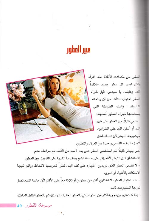بعد ذلك تأتي على ذكر أخبار وأبحاث منوعة عن العطور بشكل عام، وعطر المرأة ومستحضرات التجميل وآخر منتجات العطور الأجنبية بشكل خاص.