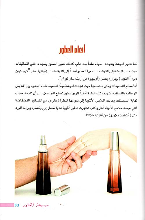 نبذة نيل وفرات:موسوعة العطور هي أول موسوعة عربية شاملة لجميع أبحاث العطور وتاريخها وصناعتها وأسرارها. وهي تلقي النظرة الوافية أولاً على تاريخ العطور ومنشأها عبر التاريخ، وتتضمن تاريخ أول خلطة اخترعها المصريون، ثم تنتقل إلى تطور هذه الصناعة في العراق، وصولاً إلى شهرة الخليج العربي اليوم وعشقه لهذه الصناعة.