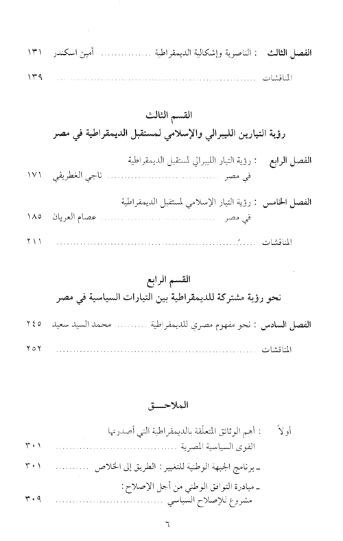 يتضمن الفصل الأخير من هذا الكتاب وثيقة بعنوان "نحو مفهوم مصري للديمقراطية" نجح الدكتور محمد السيد سعيد في صياغتها بناء على الأوراق المقدمة والمناقشات والمداولات الثرية التي تمت طيلة أيام الندوة، ولعل هذه الوثيقة جسدت الهدف الحقيقي للندوة، وهو البحث عن القواسم المشتركة بين جميع التيارات السياسية والفكرية المصرية في رؤيتها للديمقراطية، سواء كمفهوم ومبادئ أو كآليات وممارسة. إقرأ المزيد