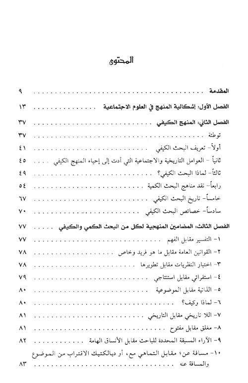 كما تطرق للمنهج الهرمينوطيقي ونشأته والمسائل الفلسفية واللاهوتية الخاصة به ضمن هذا الثراء المعرفي والمنهجي حاول المؤلف تغطية كافة الجوانب المتعلقة بالمنهج الكيفي في العلوم الاجتماعية.نبذة الناشر:إن أزمة العلوم الاجتماعية العربية أزمة متعددة الوجوه، إنها أزمة منهجية وفكرية وثقافية، ذلك أن النظريات والمناهج هما أساس الثقافة وهما الأدوات التي تتطور من خلالها الثقافة... وهما بحاجة إلى نظرية وعناية.