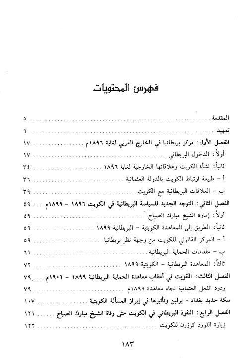 قسم الكتاب على أربعة فصول: عني الفصل الأول بدراسة تغلغل المصالح البريطانية في الخليج العربي، والتفوق الذي حققه خلال القرن التاسع عشر، وتصدي بريطانيا لمخاطر المنافسة الأوروبية التي حاولت تهديد مكانتها في أواخر القرن التاسع عشر وأوائل القرن العشرين، والمتمثلة بفرنسا وروسيا وألمانيا، كما تناول هذا الفصل نشأة الكويت وعلاقاتها مع الدولة العثمانية، وصلاتها الأولى مع بريطانيا.
