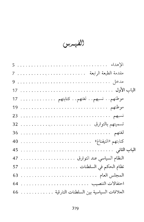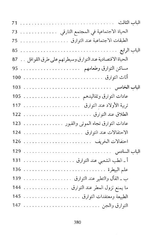 وبالعودة لأقسام الكتاب نجده قد ...قسم إلى أحد عشر باباً تحتوي على المواضيع التالية: الباب الأول: يتناول نسبهم، موطنهم، لغتهم، وكتابتهم. الباب الثاني: ويتناول النظام السياسي عند التوارق. الباب الثالث: ويحتوي على الحياة الاجتماعية في المجتمع التارقي. (الطبقات الاجتماعية). الباب الرابع: الحياة الاقتصادية عند التوارق. وسيطرتهم على طرق القوافل. الباب الخامس: عادات التوارق وتقاليدهم. الباب السادس: أ-الطب الشعبي عند التوارق. ب-الفأل والتطير عند التوارق. الباب السابع: أ-الأدب والرقص والموسيقى عند التوارق. ب-ألعابهم الشعبية. الباب الثامن: ويحتوي على دور التوارق في التاريخ الإسلامي حركة المرابطين (الملثمين). الباب التاسع: ويتناول: التوارق ودورهم في صد الاستعمار الحديث. انتفاضات التوارق ضد الفرنسيين. الباب العاشر: ويتناول: مشاهير التوارق في التاريخ. الباب الحادي عشر: ويتناول: التوارق والاستقلالات الحديثة. حاضرهم السياسي والاجتماعي. إقرأ المزيد