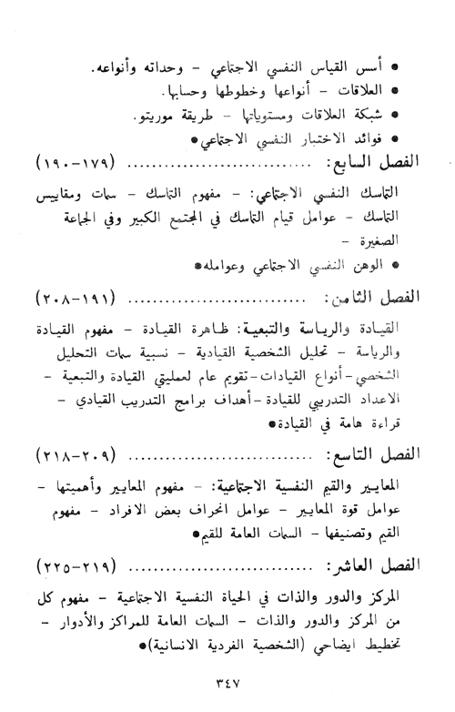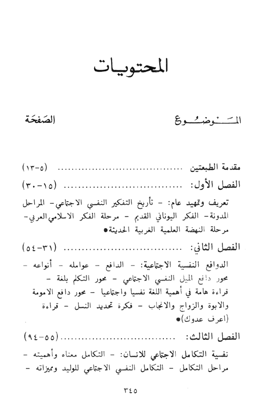 أما خطة تنظيم المواضيع فإن الكتاب يقدمها في أربعة عشر فصلاً كما يلي: أولها: تمهيدي لتحديد مفهوم العلم ومجاله إلى جانب نظرة إلى تطور التفكير النفسي الاجتماعي خلال آلاف السنين وفي المراحل اليونانية ثم الإسلامية العربية. وأخيراً في المرحلة الغربية الحديثة.