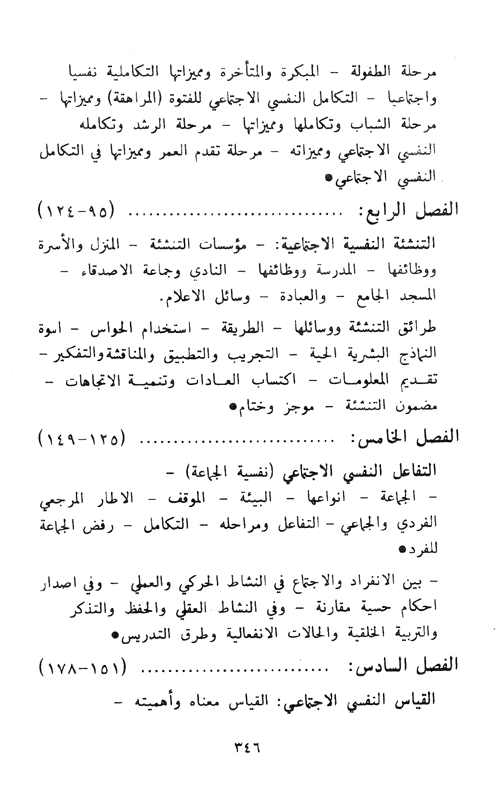 وتحت وطأة اعتدال (حجم الكتاب) مع تعدد الموضوعات فقد آثر المؤلف عدم التعرض لدراسة مناهج البحث النفسي الاجتماعي. لأن بعض مناهجه يندرج فيما درسه الطالب سابقاً في (علم النفس العام ومبادئه) مثل المنهج العلمي والملاحظة والاستقراء. والمنهج التأملي الذاتي والمنهج التجريبي أو التتبعي باتجاهاته وما يتصل بذلك من مقابلة وسيرة حياة وتأريخ حالة وقياس. وأما بقية مناهج هذا العلم فإنه يستفيدها من مناهج البحث الاجتماعي –التأريخية والوصفية والمسحية وما فيها من استبار واستفتاء.