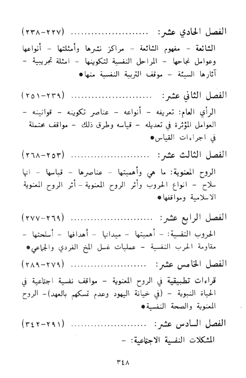 والثاني عشر: يقدم نوعاً من الحروب الإنسانية دون سلاح أنها قديمة قدم ذكاء الإنسان واتساع حيلته فالحرب خدعة. ثم أنها حديثة بمقدار التقدم التكنولوجي في وسائل الاتصال والإعلام مع المحاربين والمواطنين والحياديين والأعداء والحلفاء. إنها الحروب النفسية وما أشد حاجتنا إليها كافراد في مجتمعنا العربي الإسلامي المعاصر في فهم ما يتصل بها من دوافع ووسائل وأهداف ومراكز وقوى من وراء حجاب.