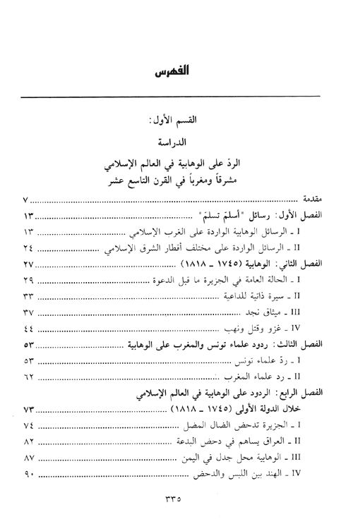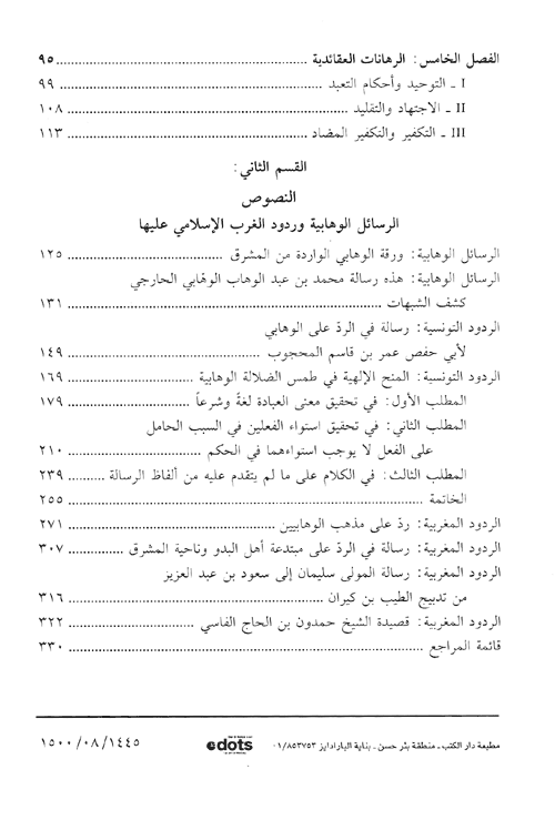 نبذة الناشر:هذا الكتاب هو أول دراسة تجمع في دراسة الوهابية ما بين العام والخاص. العام تقديم جردة وافية بالردود التي وضعت في دحض الوهابية من طرف علماء السنة شرقاً وغرباً من خلال إجراء مسح شامل لمخطوطات مبعثرة في مكتبات عربية وأجنبية، والخاص يدقق في ما نشر ويحقق في ما لم ينشر ...من ردود علماء الغرب الإسلامي، تونس والمغرب تحديداً، على هذه الدعوة، وذلك لعدم مشاركة العلماء الجزائريين في هذا الجدل.