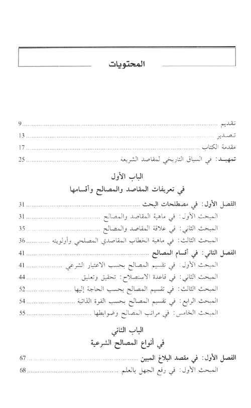الفصل الثاني: في أقسام المصالح. وهو في خمسة مباحث. وهي: المبحث الأول: في تقسيم المصالح بحسب الاعتبار الشرعي. المبحث الثاني: في قاعدة الاستصلاح: تحقيق وتعليق. المبحث الثالث: في تقسيم المصالح بحسب الحاجة إليها. المبحث الرابع: في تقسيم المصالح بحسب القوة الذاتية. المبحث الخامس: في مراتب المصالح وضوابطها.