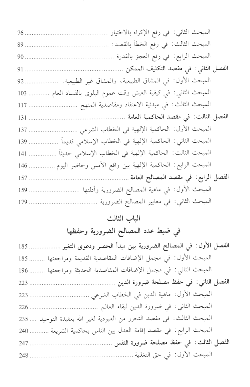 وأما الباب الثالث فخصص لضبط عدد المصالح الضرورية وحفظها وهي: الفصل الأول: في المصالح الضرورية بين مبدأ الحصر ودعوى التغير. وهو في مبحثين. وهما: المبحث الأول: في مجمل الإضافات المقاصدية القديمة ومراجعتها. المبحث الثاني: في مجمل الإضافات المقاصدية الحديثة ومراجعتها.