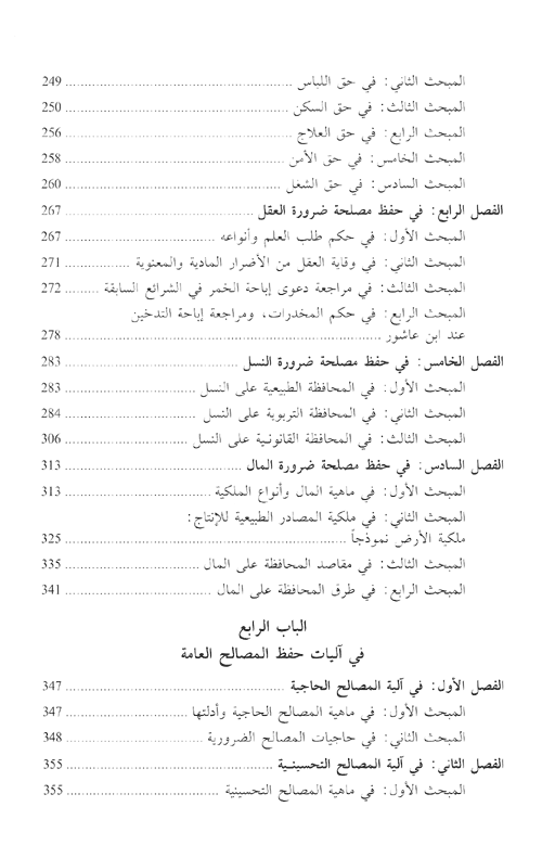 الفصل الرابع: في مقصد المصالح العامة. وهو في مبحثين، بعد التقديم لهما. وهما: المبحث الأول: في ماهية المصالح الضرورية وأدلتها. المبحث الثاني: في معايير المصالح الضرورية.